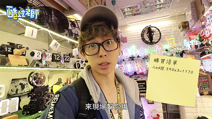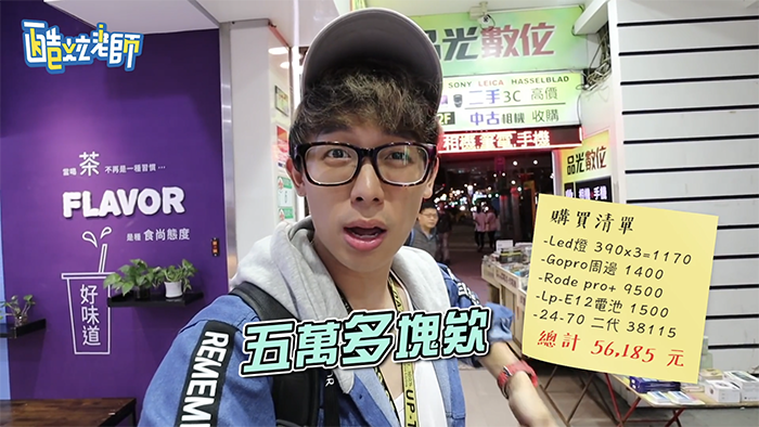 在拍片時也時常會有額外的開銷,像是周邊的陳設、美術,酷炫看見可愛的燈飾時也忍不住購入了一組,接著酷炫開始添購器具,為了拍攝出更多元的視角,購買了一些輔助的週邊器材,像是吸盤、鵝頸、機頂麥克風等相關器材,更添購了一顆二代鏡頭,過程中酷炫每到一家店就會和老闆殺價一次,老闆也都非常的豪爽,這趟採購之旅總共花了5萬6,可見當YouTuber要定時更新器材時,是一筆大開銷。