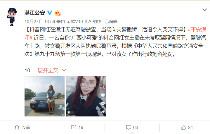 經過警方盤問後,才了解駕駛者是來自廣西的年輕女性,自稱是抖音上的一位網紅,還擁有上千名粉絲,近期是到廣東旅遊才會被員警盤查,廣西小可愛表示自己對於交通的法律認識不多,又加上存在著僥倖的心態才貿然上路,但沒想到卻面臨員警的檢查。面對員警的斥責處罰,廣西小可愛想藉由網紅身分替自己脫身,才向員警說出「我那麼可愛你們捨得拘留我嗎?我可是有好幾千粉絲的,萬一掉粉怎麼辦?」,員警們瞬間傻眼,擔心她的智商不足,為她惡補了許多法律的相關條文,在中國無照駕駛被查獲將處以人民幣200元以上2000元以下罰款,並處15天以下拘留,經過員警的教化之後,廣西小可愛才對自己的行為感到萬分後悔,並表示願意承擔相關的法律責任,日後會在注意自己的行為絕不再違反交通規則。