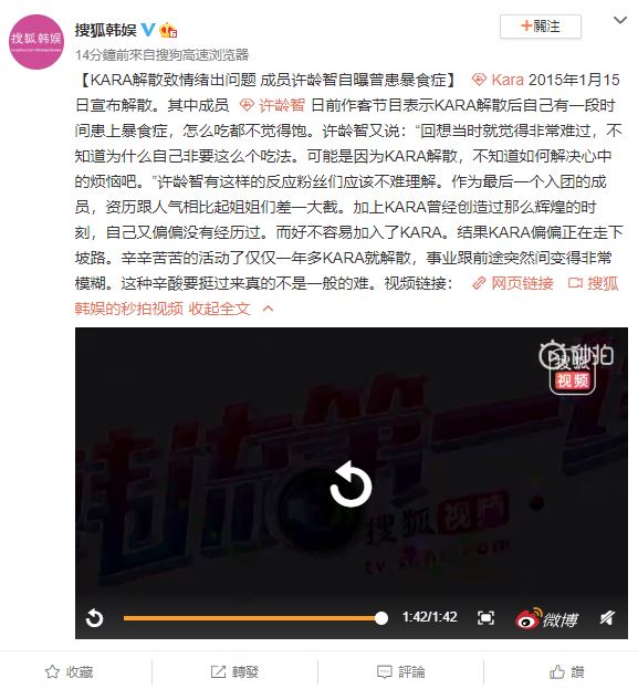 現年24歲的齡智,當時還未成年就加入當紅女團KARA,隨著成員合約到期一一離開,公司沒有正式宣布解散KARA,而是讓齡智以單人身分繼續演藝活動。對此,齡智日前錄製節目《SBS Special》,透露有一段時間身陷情緒障礙而罹患暴食症,她解釋「吃再多都不覺得飽」。
