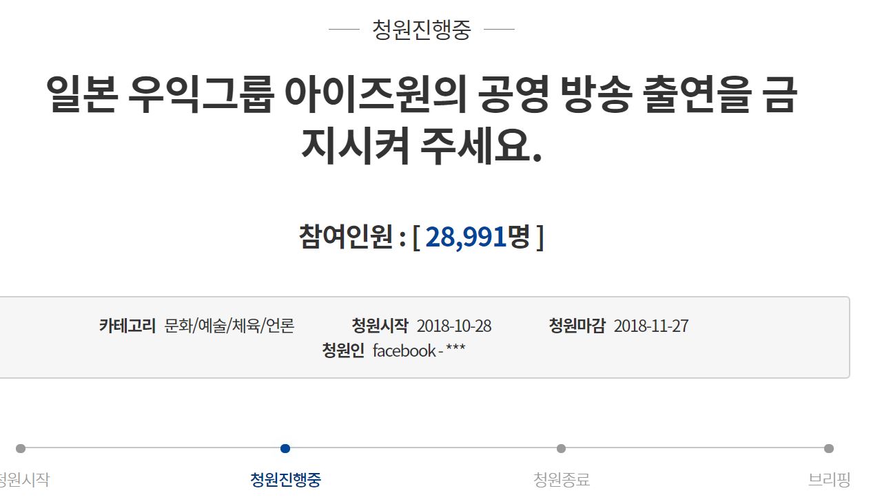 如今IZ*ONE將登上國營音樂節目,讓國民相當不滿,27日甚至上書韓國政府青瓦台,並以《請禁止日本右翼組合IZ*ONE參加公營電視節目》為題發文請願。文中先解釋,「AKB48是積極參加日本右翼活動的組合,此次作為IZ*ONE成員出道的成 員中也有參加過右翼相關演唱會等經驗。」,接著提出訴求並寫到「KBS是根據《廣播法》進行的國家營運廣播,也是收取普通國民的收視費的電視臺。」、「出演私企Mnet和出演公營電視臺KBS是兩回事,希望公營電視臺KBS、MBC、EBS中不能有IZ*ONE'出演」截至目前為止有超過2.8萬人次連署,必須要在30天內達成20萬人次,才有機會請願成功。