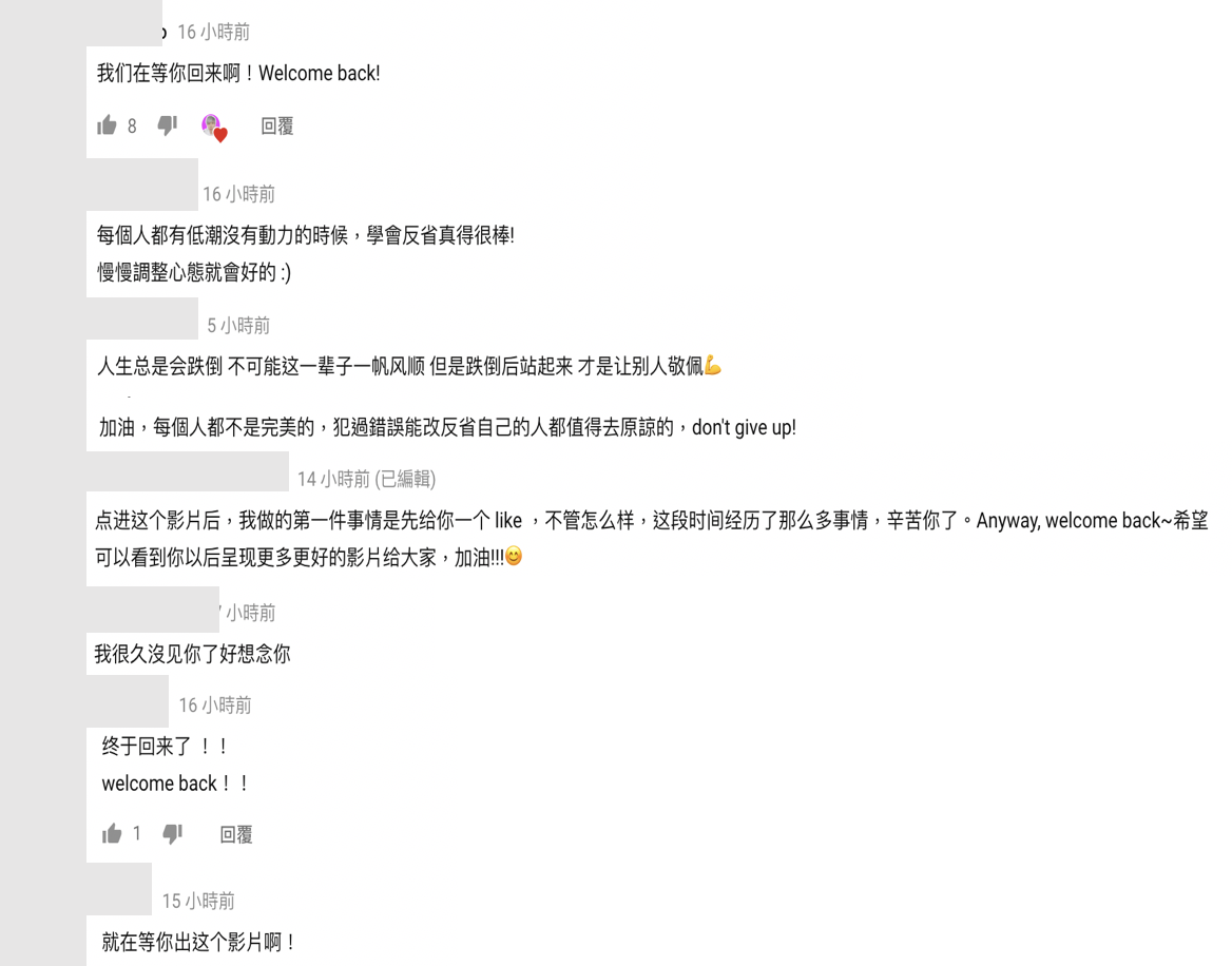 Cody也感性的和觀眾說:「我覺得我跟看我影片的你們,是有一層關係在的」、「也因為你們,才讓我有機會去認識這些,我從來沒想過會有機會見到的這些人」、「你們是我最大的動力」,網友也紛紛留言鼓勵:「加油,每個人都不是完美的,犯過錯誤能改反省自己的人都值得去原諒的,don't give up !」、「我們在等你回來啊!Welcome back!」、「每個人都有低潮沒有動力的時候,學會反省真得很棒!」、「人生總是會跌倒不可能這一輩子一帆風順但是跌倒後站起來才是讓別人敬佩」、「我很久沒見你了好想念你」,給予Cody溫暖的打氣和鼓勵。