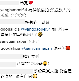 照片PO出之後,許多網友紛紛留言:「鎖骨女神」、「好美的...風景」、「漂亮」、「莎爺果真大膽 對自己的身材...很有自信」,就連同為youtuber的楊寶貝和三原都寫下:「有種被偷拍,然後放大的質感哈哈哈哈」、「色色」,愛莉莎莎也親自回覆:「如果狗仔會幫我拍美照就好了」,更對三原直說:「你最色」。