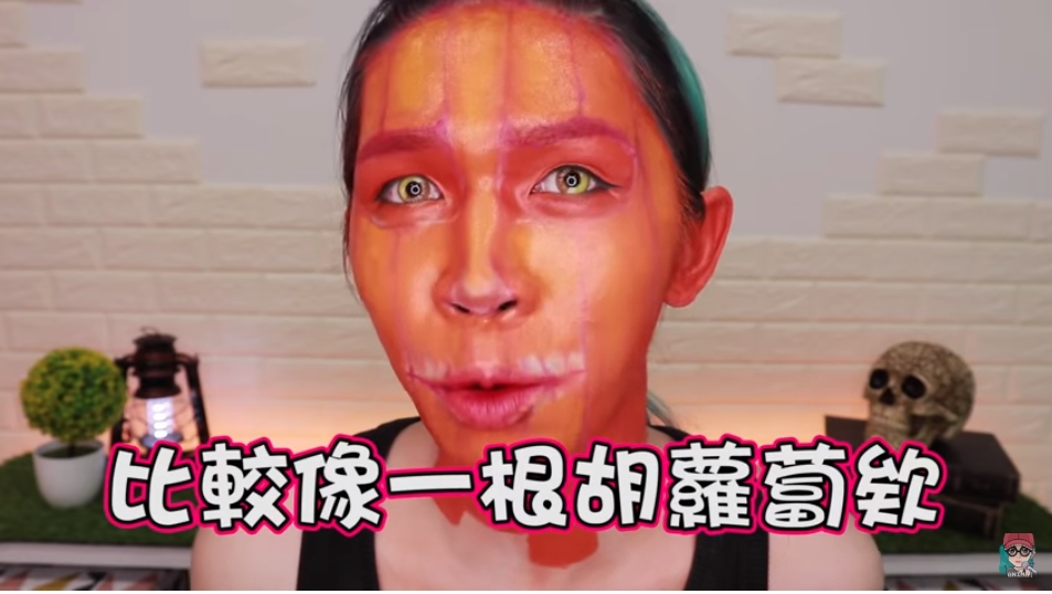 YouTuber傅長膨先前曾推出一個「萬聖南瓜妝-冷豔版」獲得網友狂讚,如今再度推出加強版「萬聖南瓜妝-烈焰版」,並且在開始畫之前就喊話表示要把這個妝容變成「走出門就要把小孩嚇哭」的妝容。她先在臉上畫出輪廓,接著用人體油性彩繪顏料調出「橘色」後在上到自己臉上,接著又加了一點「黃色」增加立體度,畫完後整臉又黃又橘的模樣,更讓他自嘲自己像是個「胡蘿蔔」。