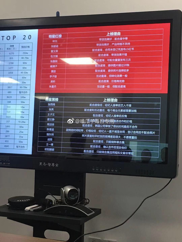 黑榜中,第一名是近期爆發離婚醜聞的女主持人張雨綺,理由在於「配合度極低,經紀人接單後藝人不接」,而第二、三名分別是演員張克、王子文,理由都是配合度太低或是價錢問題;此外,較為台灣民眾所知的尚有第六名的陳意涵,原因是「經紀人一直不肯簽合約,簽合約後不配合照片」,以及第十名的歐陽娜娜,並解釋「配合度低,只能做合集且同框和文案非常軟」。
