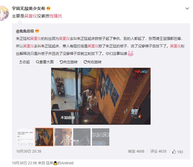 沒想到,嚇醒的朱正廷趕緊說了一句「我沒穿褲子」試圖阻止吳宣儀掀被子,而吳宣儀這時才尷尬停止動作,並快步溜出房間,連聲喊「沒事」。