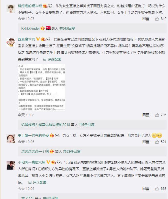 影片一出立刻引起網友正反兩方論戰,有人認為朱正廷上實境秀「竟裸睡不太妥」,吳宣儀只是叫她起床,卻無辜遭網友抹黑成「性騷擾」,不過更多人談及相互尊重的問題,並表示「女藝人未經允許,擅自進入男性房間,這樣對不對」、「別人多次勸阻的情況下,仍執意進入男生臥室多次直接去掀男生被子,在男生用『沒穿褲子』婉言提醒後仍不甘休,得體嗎?」對此,雙方尚未出面解釋,但是男女雙方粉絲仍然僵持不下