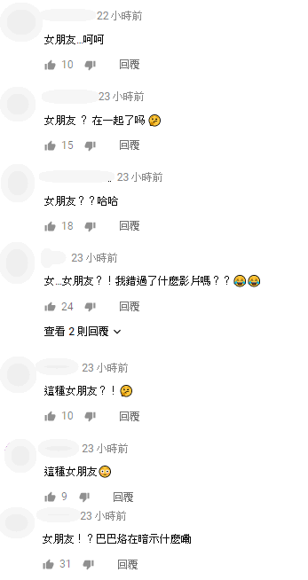 而也因為巴巴烙的話,影片發布之後,許多網友紛紛留言:「女朋友!?巴巴烙在暗示什麼嘞」、「女朋友…呵呵」、「女朋友 ? 在一起了嗎」、「女朋友??哈哈」、「女…女朋友?!我錯過了什麼影片嗎??」、「這種女朋友?!」、「這種女朋友」。