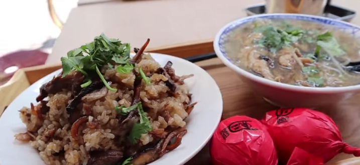 接著,酷的夢的第二站「Uben油飯」,餐桌上擺著熱騰騰的道地油飯及辦桌羹,讓食指大動的酷的夢興奮地拿起油飯,「香菇很有嚼勁」,接著表示該店家的油飯吃起來相當順口,完全沒有油膩感,除此之外,他還大膽地嘗試店家有名的辣醬,才剛吃一口下去酷的夢臉色大變,滿臉通紅地配飲料喝,才緩解口中的辣度。