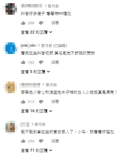 事實上,有美國女生表示:「看到世界另外一面是很不一樣的」,還有不少人認為抖音平台上的使用者很會運鏡,紛紛感到驚訝:「創意多了,技術強多了,很酷」。另外,「外國人看抖音」影片曝光後,許多網友忍不住笑虧:「他們看得好尷尬」、「讓我尷尬癌發作」、「丟臉丟到國外了」、「傻B合輯」。