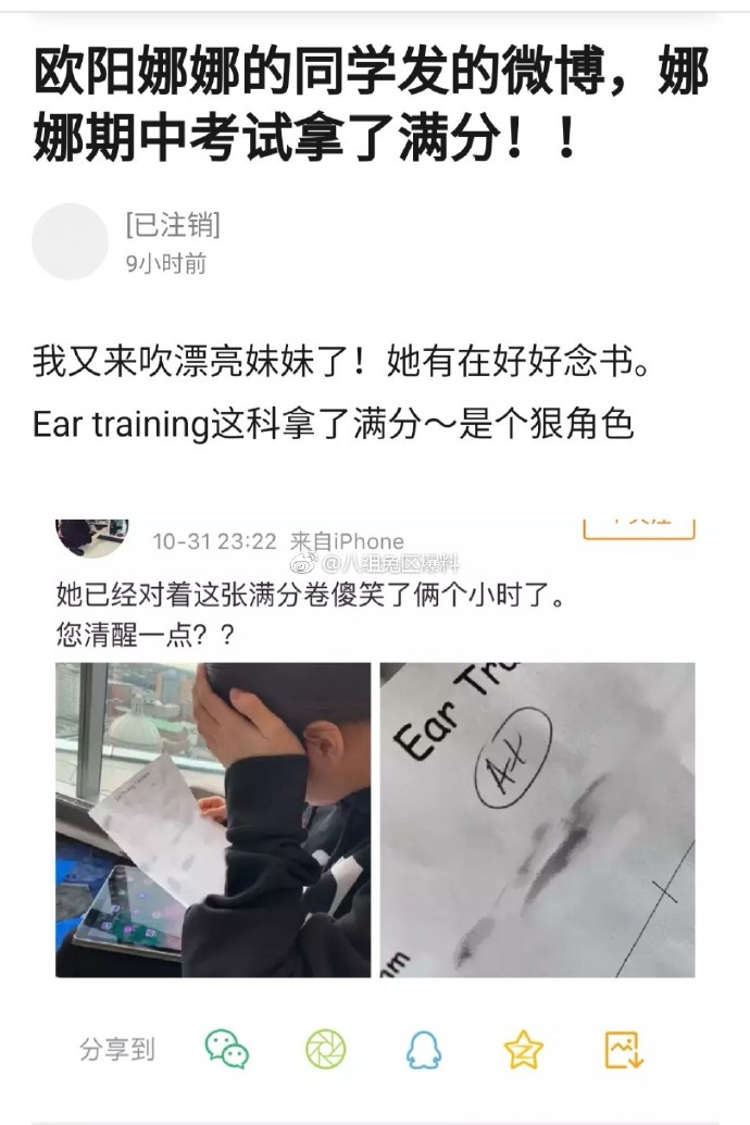 今日,網路上流傳歐陽娜娜的同學在微博發布一則貼文,標題顯示「娜娜期中考試拿了滿分」。除向外界報告好消息,網友也說到「她有在好好念書」,並稱讚歐陽娜娜不僅外在漂亮,學業表現也很優異並說到「Ear Training這科拿了滿分,是個狠角色」。