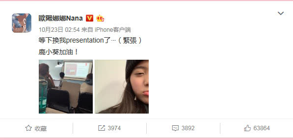 上月23日,歐陽娜娜就曾在微博發文表示「等下換我presentation(報告)了」,不過也積極向自己喊話「鹿小葵加油」,不知道是不是因為這五個字奏效,歐陽娜娜終於順利通過期中考試。