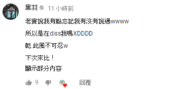 而影片播出之後,黑羽便在下方親自回覆:「老實說我有點忘記我有沒有說過wwww,所以是在diss我嗎XDDDD,乾,此風不可忍,下次來比!」不過含羞草則沒有多作回覆。