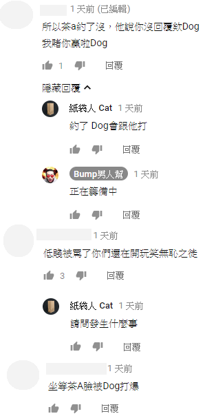 另一方面,在10月18日時youtuber「茶A」曾公開在頻道「SorryBoner」中向Dog宣戰,表示自己看不慣男人幫這次整人行徑,「我要把你call out,我要和你比一場正式的拳擊比賽」,更嗆Dog很孬!而這次男人幫發布影片,也表示確定會與茶A對決:「Dog跟茶A的比賽還是會在這個頻道播出給大家看」,Dog也用Cat紙袋人的帳號在下方回覆網友:「約了Dog會跟他打」,宣布參戰。