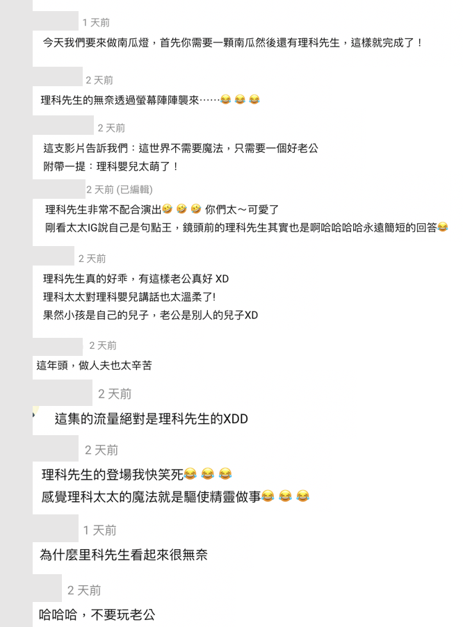 理科太太也提供一個防止南瓜燈快速腐爛的方式:「在內層塗油或是稀釋後的漂白水」或是「在外層塗上凡士林」,就可以讓南瓜燈多擺設幾天了。看完影片中理科先生畫龍點睛的演出,網友也紛紛留言:「理科先生的無奈透過螢幕陣陣襲來⋯」、「今天我們要來做南瓜燈,首先你需要一顆南瓜然後還有理科先生,這樣就完成了!」、「理科先生真的好乖,有這樣老公真好 XD」、「這位Dobby做事太不情願,主人快懲罰他!」、「理科先生非常不配合演出,你們太~可愛了」、「這年頭,做人夫也太辛苦」、「這集流量絕對是理科先生的」、「為什麼理科先生看起來很無奈」、「哈哈哈,不要玩老公」