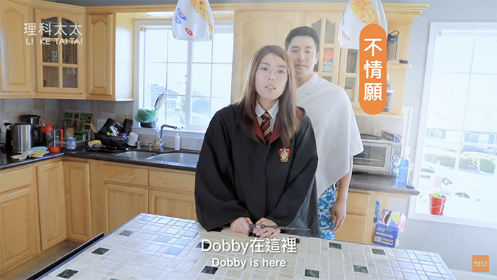 影片中,理科太太身著魔法師的裝扮,並且使用魔法將「家庭小精靈」召喚出來,這位小精靈就是理科先生「Dobby」,他要和理科太太一起完成南瓜燈。製作南瓜燈的第一步,需要先將南瓜底部挖一個洞,下一步要將臉刻出來,經過一番功夫將眼睛和嘴巴完成後,再將蠟燭點燃從底部放置於南瓜中間,如此一來就完成可愛的南瓜燈了!