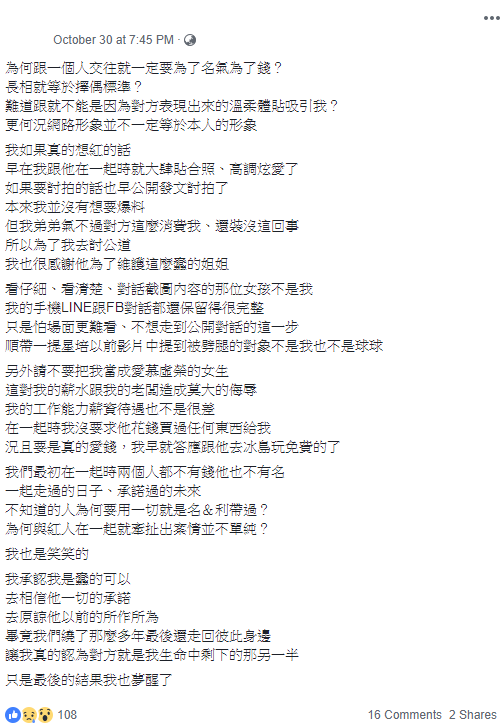 而女方「茜茜」在30日透過個人臉書發文,其中她首先提到自己本來並不想爆料,「但我弟弟氣不過對方這麼消費我、還裝沒這回事,所以為了我去討公道」,她也澄清自己並不想紅,不過仍然很謝謝維護自己的弟弟!同時她針對事件爆發之後網友的疑問作出回應,表示爆料公社中,弟弟PO出的對話截圖和照片都不是自己,而是星培的曖昧對象,「我的手機LINE跟FB對話都還保留得很完整,只是怕場面更難看、不想走到公開對話的這一步」。