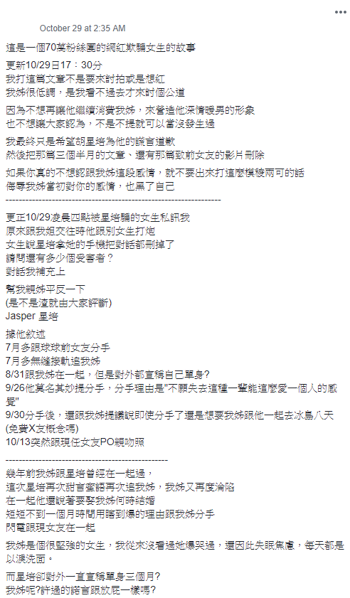 星培在PO完洗白貼文之後,便有網友在臉書社團「爆料公社」投稿,其中內容指出星培在與球球分手後便無縫接軌追求前任,也就是爆料者的姐姐「茜茜」。兩人復合後,星培卻又在期間和別人搞曖昧發生關係,還將曖昧對象的對話紀錄全數刪光。之後九月底星培莫名其妙和「茜茜」提分手,甚至分手後還邀請對方一起去冰島八天,之後他便在IG中和現任放閃,讓「茜茜」每日以淚洗面。