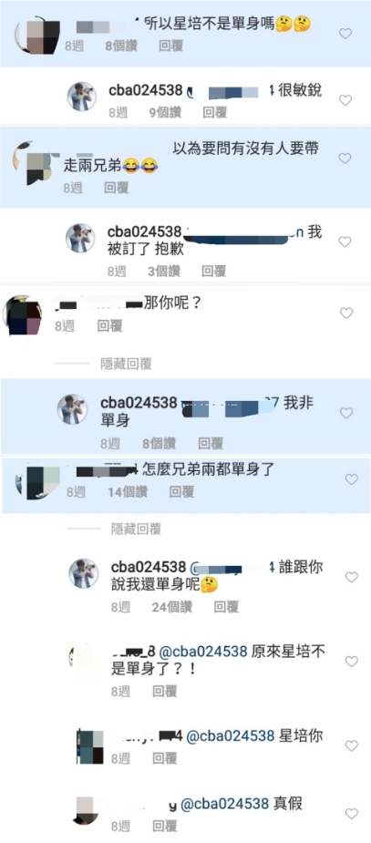 事實上近日也有網友貼出星培在8月22日曾經PO出和茜茜的合照,當時星培還打下「好久不見」,9月6日時他更曾在IG留言處回應網友「我被訂走了,抱歉」、「我非單身」,自曝自己根本不是單身,也打臉自己現在所說的單身三個半月!