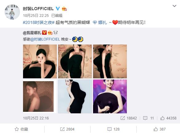 25日,眾多演員接獲邀參與「LOFFICIEL2018時裝周」,其中古力娜扎以「黑蝴蝶」的形象現身,她身穿典雅黑色緊身窄洋,完全凸顯出她的窈窕身材,而洋裝背後波浪狀的剪裁,從正面看過去就像是一隻黑蝴蝶,整體造型相當有氣質。