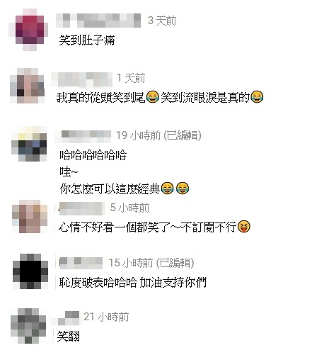 影片一出爐就引發許多討論,網友們都說:「笑到肚子痛」、「我真的從頭笑到尾,笑到流眼淚是真的」、「哈哈哈哈哈哇~你怎麼可以這麼經典」、「心情不好,看一個都笑了~不訂閱不行」、「恥度破表哈哈哈 加油支持你們」、「笑翻」