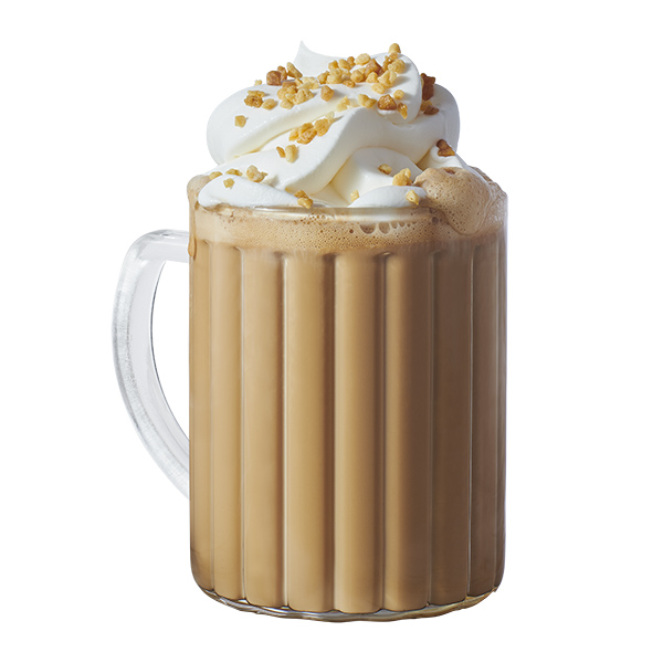 現蒸牛奶加上完美濃縮與太妃核果糖漿,再擠上香滑的鮮奶油,撒上口感十足的的太妃蜜糖碎片,除了絲滑般的口感還增添了一些層次,是聖誕節都必喝的幸福飲料呢!