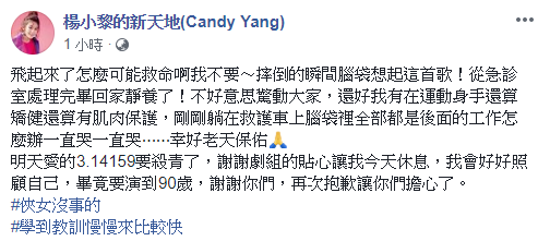 楊小黎事後也在臉書報平安,她表示自己已經回家靜養了,直說自己平時有在運動,身手還算矯健,所以沒有受到很嚴重的傷。不過敬業的她,在救護車上想的竟然是「後面的工作怎麼辦!」無助地她不停的哭。她也說,很感謝劇組讓她休息,直說自己要演戲演到90歲,所以一定會好好照顧自己,要大家別擔心。