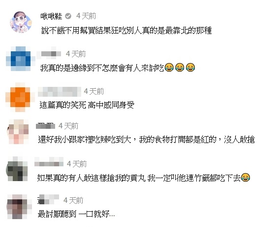 影片下方留言,引來許多深有同感的網友們前來留言:「這篇真的笑死 高中感同身受」、「還好我小跟家裡吃辣吃到大,我的食物打開都是紅的,沒人敢搶」、「如果真的有人敢這樣搶我的貢丸,我一定較他連竹籤都吃下去」、「最討厭聽到 一口就好...」、「我真的是邊緣到不怎麼會有人來討吃」,網紅「啾啾鞋」也回應:「說不餓,不用幫買,結果狂吃別人,真的是最靠北的那種」。