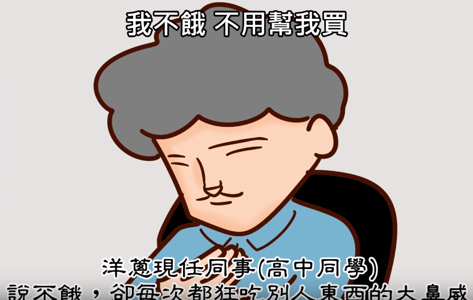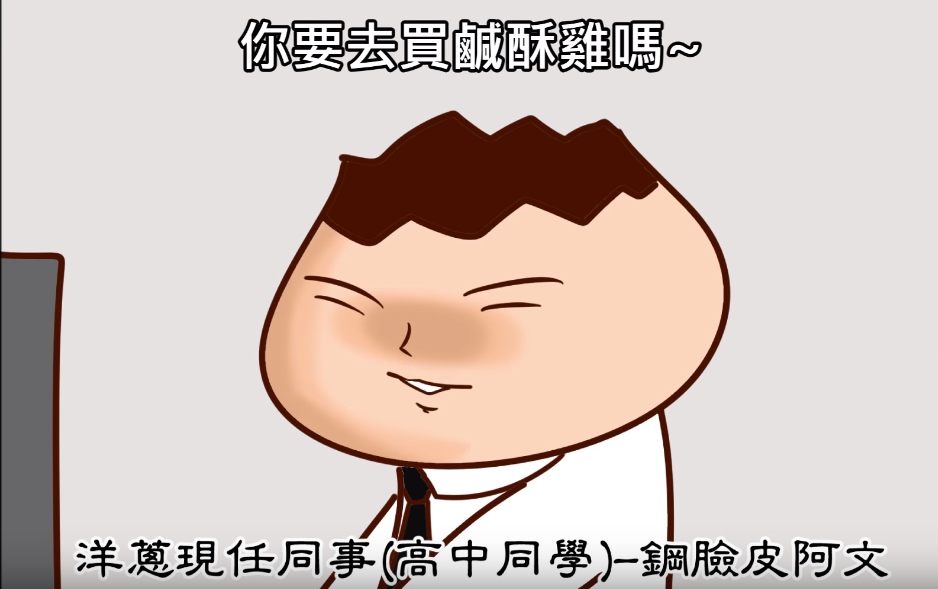 直到畢業後,Onion man再也沒去福利社買過東西,但出社會後仍有一些討厭的同事必須得面對,兩個同事都是高中的同班同學,感覺每次都虎視眈眈著Onion man去買東西吃,還有那種非常令人討厭的類型,每次說不餓不用幫他買東西,卻在人家買東西回來後卻要求吃別人的人。
