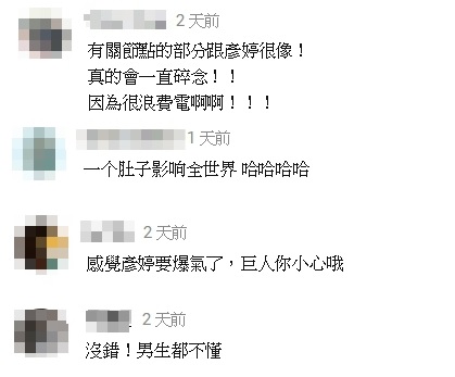 影片結束後,也引起許多網友們的前來留言,例如:「有關節電的部分跟彥婷很像!真的會一直碎唸!!因為很浪費電啊!!!」、「一個肚子影響全世界 哈哈哈哈」、「感覺彥婷要爆氣了,巨人你小心哦」、「沒錯!男生都不懂」。