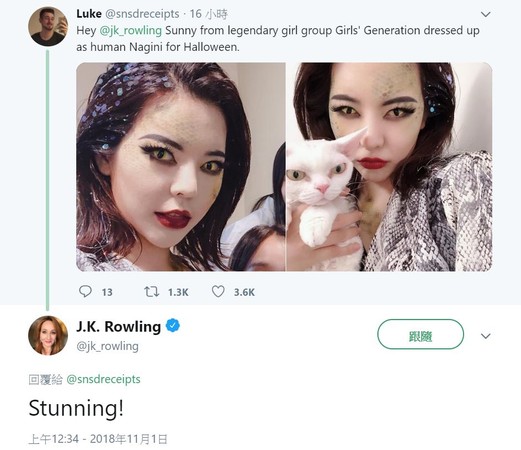 然而沒想到的是Sunny的精心裝扮,竟釣出J.K.羅琳本尊!有網友將Sunny的納吉尼扮相貼在推特上,再標註電影原著作者「J.K.羅琳」的帳號,果不期然,J.K.羅琳本尊竟來留言,更寫下「Stunning!(令人驚嘆)」給予極美評,使得該推文引發超過千次轉推。