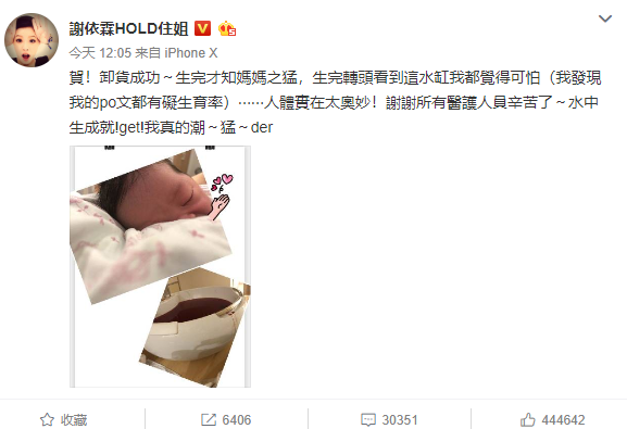 4日中午,「Hold住姐」謝依霖透過微博向粉絲們公開宣布:「卸貨成功啦~」並附上一張寶寶出生的照片,消息一出讓網友紛紛湧入該發文表示祝賀!不過發文中卻有一個讓人感到驚恐的亮點,照片當中有一大缸深紅血水超嚇人,連謝依霖都驚呼「我都覺得可怕!」讓人不禁感嘆:「媽媽真偉大」。