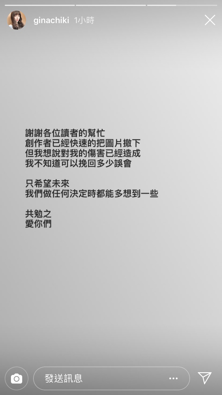 Gina更再次強調:「我在這邊重申,這個故事跟我還有佩佩無關,我很珍惜我的另一伴,絕不會打出這樣的標題」。後來Gina再次發布限時動態,表示對方已經快速的將圖片撤下,不過她仍然表示:「但我想說對我的傷害已經造成,我不知道可以挽回多少誤會」,對於此事仍然相當介懷。