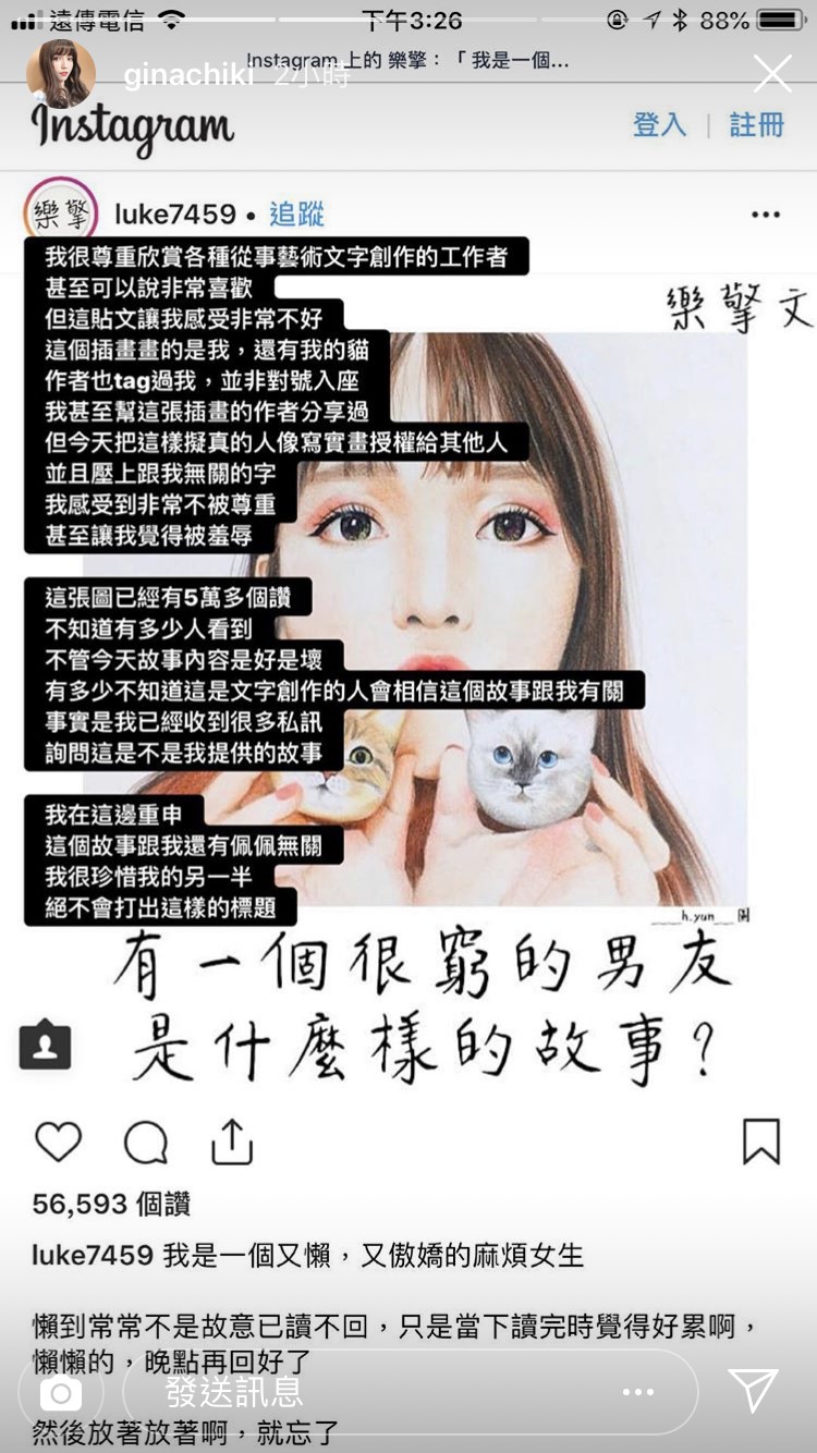 然而近日Gina透過IG發文,其中她表示自己「非常喜歡藝術文字創作工作者,但這貼文讓我感受非常不好」,只見Gina文字背景,便是「樂擎」的IG截圖,可以明顯看到配圖為Gina的擬真畫像,卻打上:「有一個很窮的男友是什麼樣的故事」,下方則為樂擎的文章,乍看之下確實非常容易誤導觀眾Gina為故事主角!對此Gina表示:「今天把這樣你真的的人像寫實畫授權給其他人,並且壓上跟我無關的文字,我感受到非常不受尊重,甚至讓我覺得被羞辱」,而Gina也表示已經有非常多人私訊詢問是否是她提供的故事,讓她相當無奈。