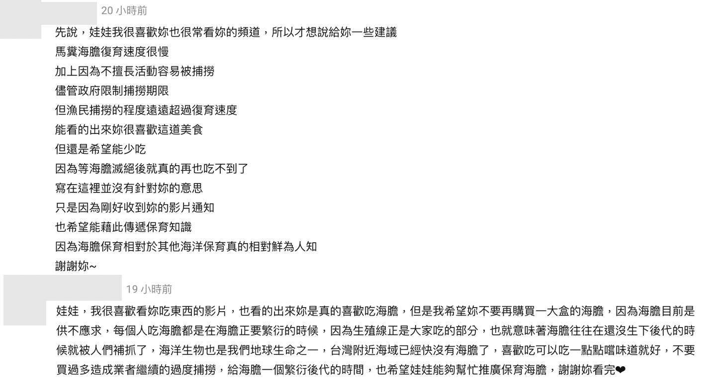 影片下方也有網友提到關於馬糞海膽的小知識:「馬糞海膽復育速度很慢,加上不擅長活動容易被捕撈,儘管政府限制捕撈期限,但漁民捕撈的程度遠遠超過復育的速度,希望能夠藉此傳遞保育知識,因為海膽保育相對於其他海洋保育真的相對鮮為人知」、「海膽目前是供不應求,每個人吃海膽都是在海膽正要繁衍的時候,也就意味著海膽往往在還沒生下後代的時候就被人們補抓了,台灣附近海域已經快沒有海膽了」,讓古娃娃和網友們都長知識了。