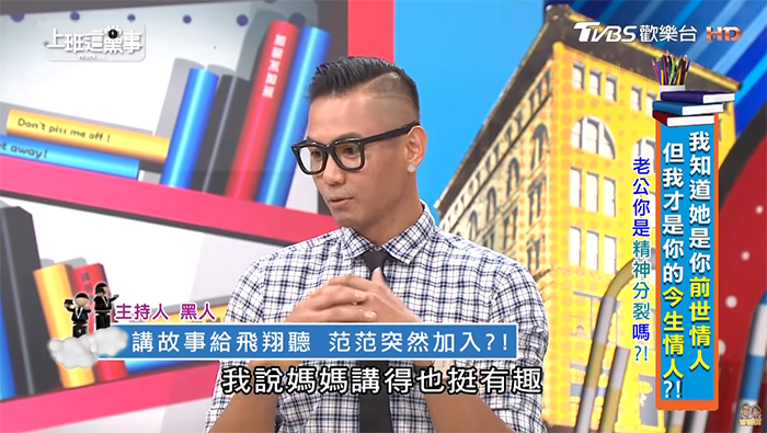 近日他在《上班這檔事》中透露,因為自己比較敢放膽演出,肢體動作的表演也比較多,睡前的床邊故事很生動,讓飛飛翔翔總是聽得如癡如醉。某次,黑人關起燈準備開始講故事,中途范范也想融入他們,就怕這個場面沒有她在,會影響在兒子們心中的地位。