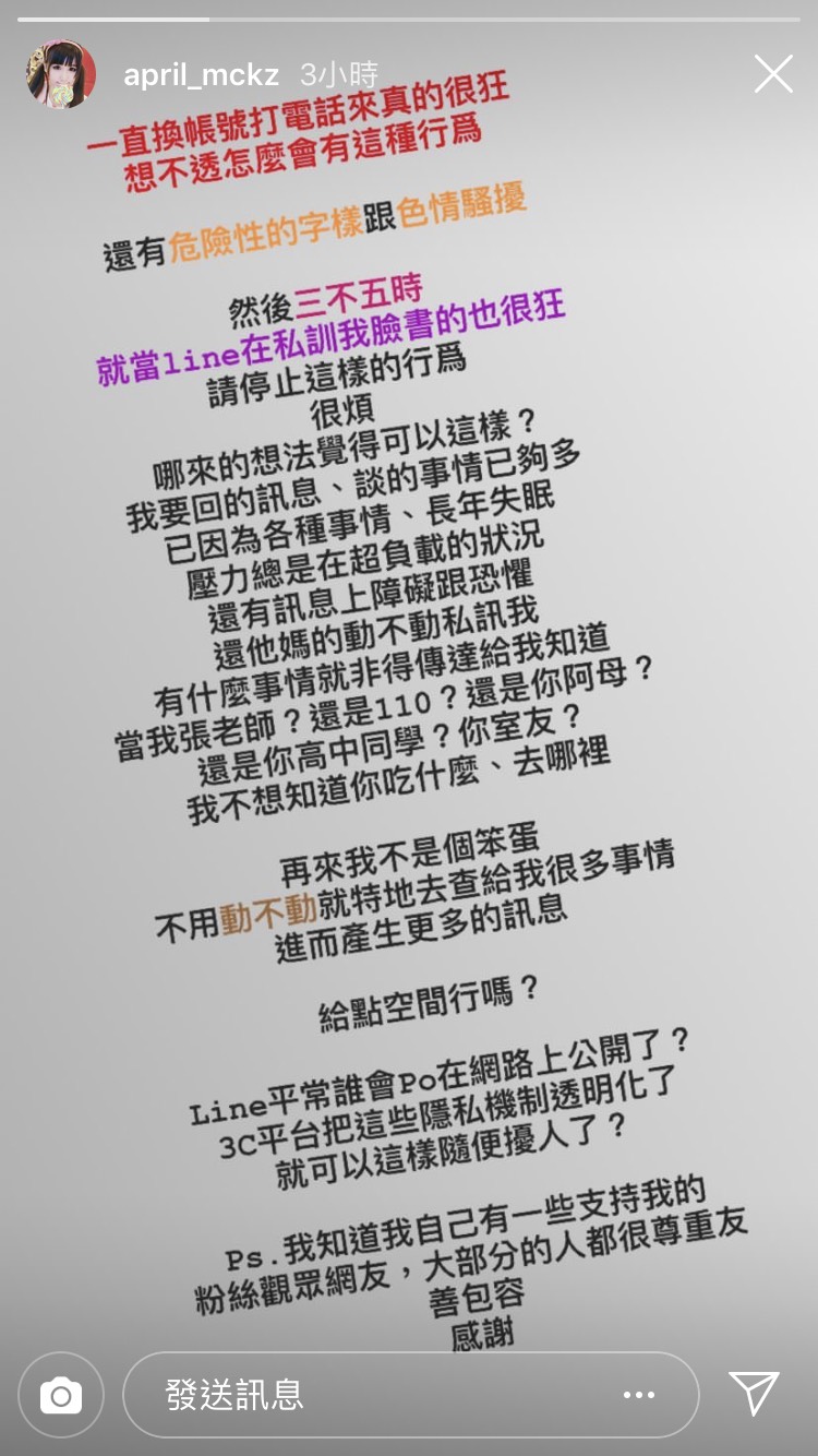 四月桐上週透過限時動態表示因為不斷被騷擾,讓她忍無可忍,甚至「連實況都不想開」,情況相當嚴重。怎料這週卻未見好轉!只見四月桐昨透過IG重申,表示對方「一直換帳號打過來真的很狂,想不透怎麼會有這種行為」,她更指出自己收到的騷擾包含:「危險性字樣、色情騷擾」,表示自己因為長此以往的壓力,已經造成她「訊息上的障礙跟恐懼」!