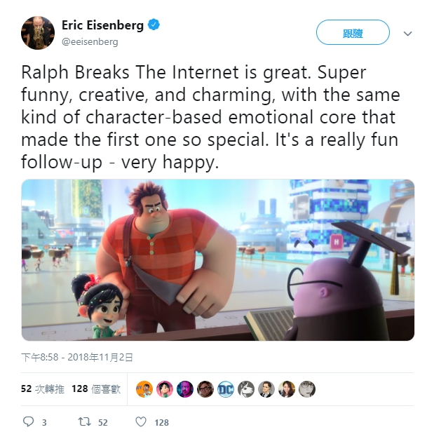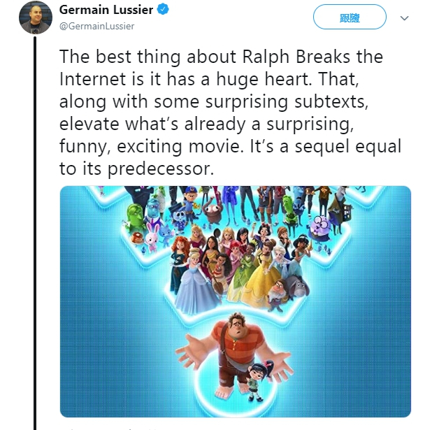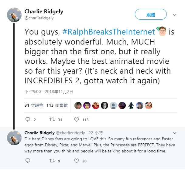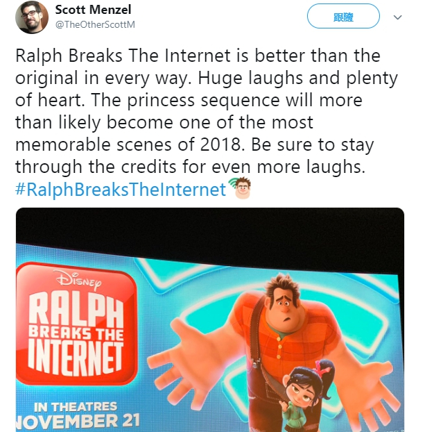 《無敵破壞王2》太精采了,比第一部規模大上許多卻依然很棒,也許會是今年最棒的動畫電影?和《超人特攻隊2》媲美,會讓你想再刷。 迪士尼粉會愛死這部,超多有趣哏和彩蛋,範圍遍及皮克斯、漫威。公主場景非棒,份量比你想像的還多,大眾肯定會有很長一段時間都在討論這場戲。