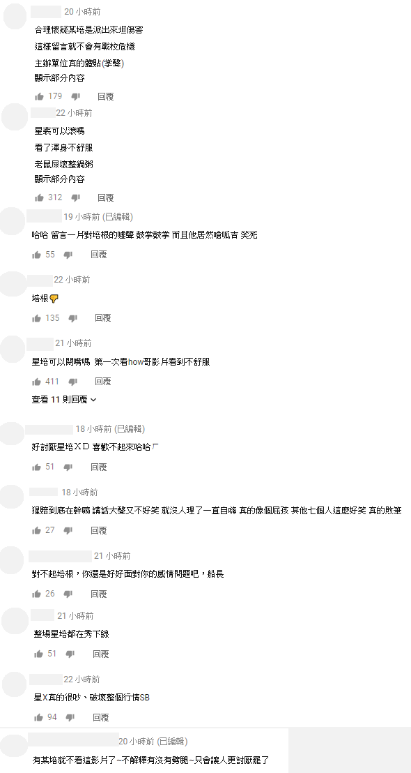 只見網友紛紛留言:「樓下酸培根的都給我注意一點啦 害我的手按讚按到手酸」、「不過可以不要請培根嗎 有點礙眼」、「合理懷疑某培是派出來坦傷害 這樣留言就不會有戰校危機 主辦單位真的體貼」、「星培可以滾嗎 看了渾身不舒服 老鼠屎壞整鍋粥」、「留言一片對培根的噓聲 鼓掌鼓掌 而且他居然嗆呱吉 笑死」、「抱歉了培根」、「星培可以閉嘴嗎 第一次看how哥影片看到不舒服」,更有不少網友表示自己第一次按「倒讚」就是因為星培。