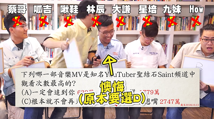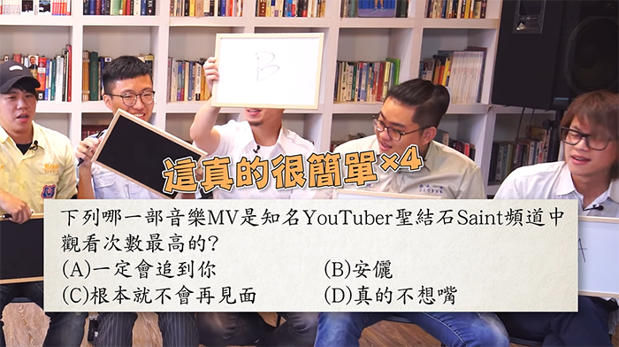 有趣的是所有題目分為學科題及常識題,其中大家也被問到「哪部音樂MV是聖結石頻道中觀看次數最高的?」,沒想到最終竟然沒人答對,讓眾人直呼「好尷尬」,聖結石的好友林辰也對鏡頭搞笑道歉:「聖結,因為你在我心中好不好,對不起,我的錯」,讓大家笑翻。