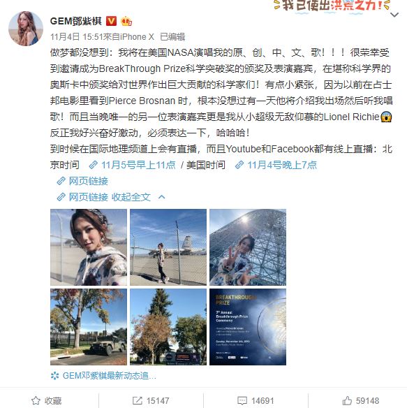此前,鄧紫棋在微博的發文也難掩興奮,文中除透露心情緊張,她更開心當晚和她同是表演嘉賓的藝人,竟是她從小就十分仰慕的偶像萊諾李奇(Lionel Richie)。