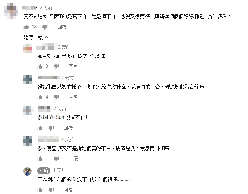 但影片在網路上的留言,就有網友忍不住質疑,兩人究竟是不是不合,因此掀起論戰,該名網友說:「真不知道妳們兩個是真不合,還是假不合,感覺又很要好,拜託妳們倆個好好相處拍片給我看。」,別名網友為此反駁:「節目效果而已 她們私底下很好的。」、另一位網友也幫腔:「講話很自以為的樣子= =她們又沒欠妳什麼,就算真的不合,硬逼她們裝合幹嘛?」,許瑜本人也在回應此則留言,並解釋:「可以關注我們的IG 沒不合啦 我們很好......」語氣看似十分無奈。