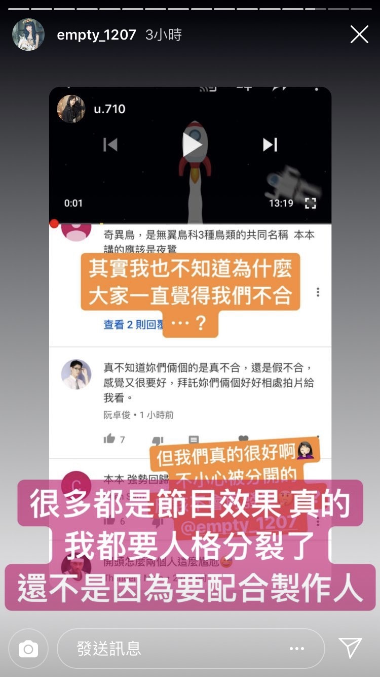 事後許瑜在個人Instagarm的限時動態上,也有附上留言截圖:「其實我也不知道為什麼,大家一直覺得我們不合...?」但她也強調:「我們真的很好」,對此本本也在限時動態做出回應:「很多都是節目效果,真的 我都要人格分裂了 還不是因為要配合製作人。」