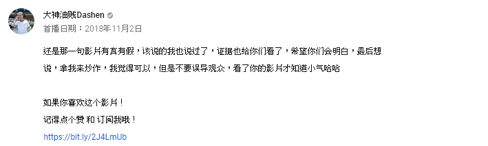 而針對吐槽他的「Rexter」,大神則表示:「你不要把你的觀點,當成100%真實度,要觀眾去相信你,你不要以個人猜測來誤導觀眾」,更在資訊欄直言:「拿我來炒作我覺得可以,但不要誤導觀眾,看了你的影片才知道小氣哈哈」,他也再度說明:「影片有真有假,該說的我也說過了,證據也給你們看了,希望你們明白」。
