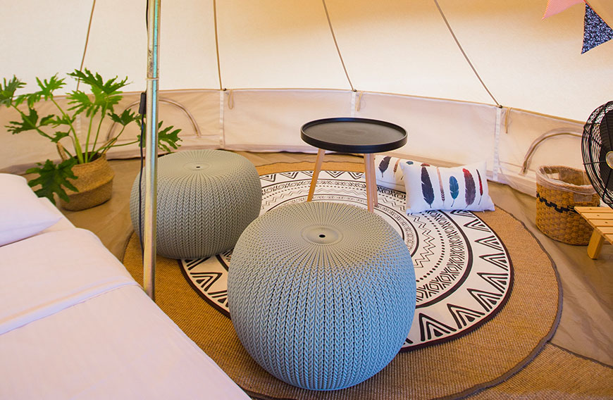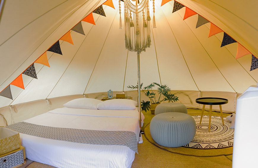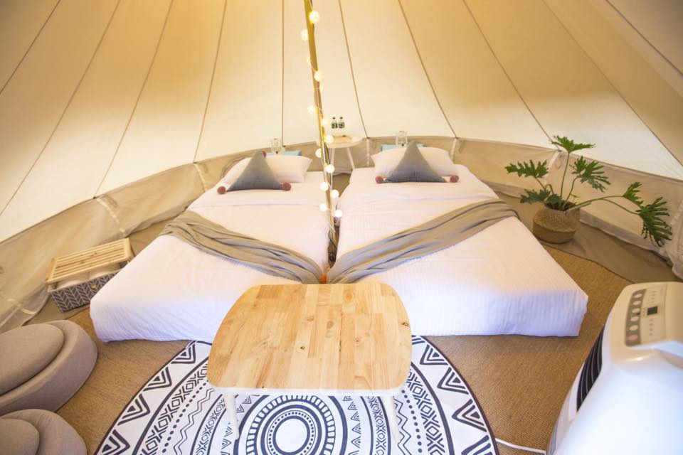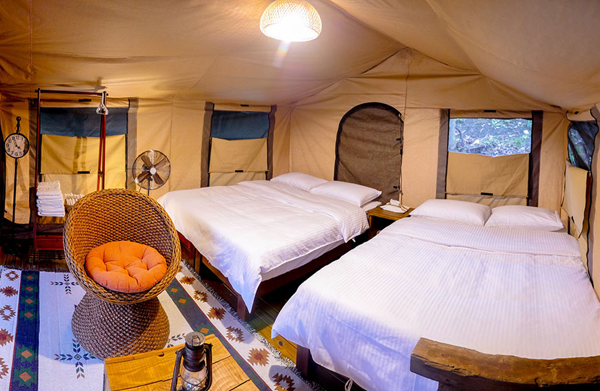 帳篷內空間寬敞,有無線網路、移動式冷氣(夏天提供)、電熱毯(冬天供應)、盥洗用具、提供早餐…基本該附的設備一樣都不少。也別以為是帳篷,房間就很簡陋,老闆還特地在帳篷內佈置民俗圖騰的地毯、傢俱跟植物,老實說還比都市內的旅館還要奢華呢!