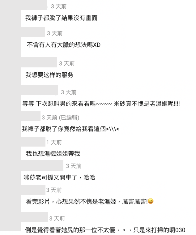 這次米砂將影片敘述僅打上「海底撈」,令人耐人尋味,而看完影片網友也紛紛留言:「我想要這樣的服務」、「看完影片,心想果然不愧是老濕姬,厲害厲害!」、「倒是覺得看著她尻的那一位不太優,只是來打掃的啊」、「不會有人有大膽的想法嗎XD」、「米砂老司機又開車了,哈哈」、「等等 下次想叫男的來看看嗎~米砂真不愧是老濕姬呢!」、「我褲子都脫了你竟然給我看這個>\\\<」、「我褲子都脫了結果沒有畫面」、「我也想濕姬姐姐帶我」,連阿滴也在下方留言:「居然真的花錢請來XDDD」
