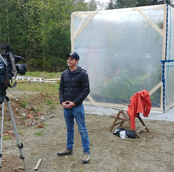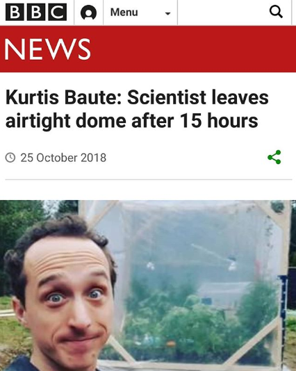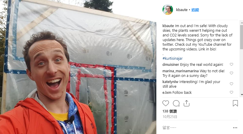 居住在加拿大卑詩省的「Kurtis Baute」,在自己兄弟家的後院搭起了塑膠棚子,準備開始他的瘋狂實測。其實早在8月他就透過自己的YouTube頻道向粉絲宣布這項大膽計畫。他想透過實測證明自己在與植物密閉共處的空間裡,所吐出的二氧化碳能及時轉化成足夠的氧氣,並存活至少3天。
