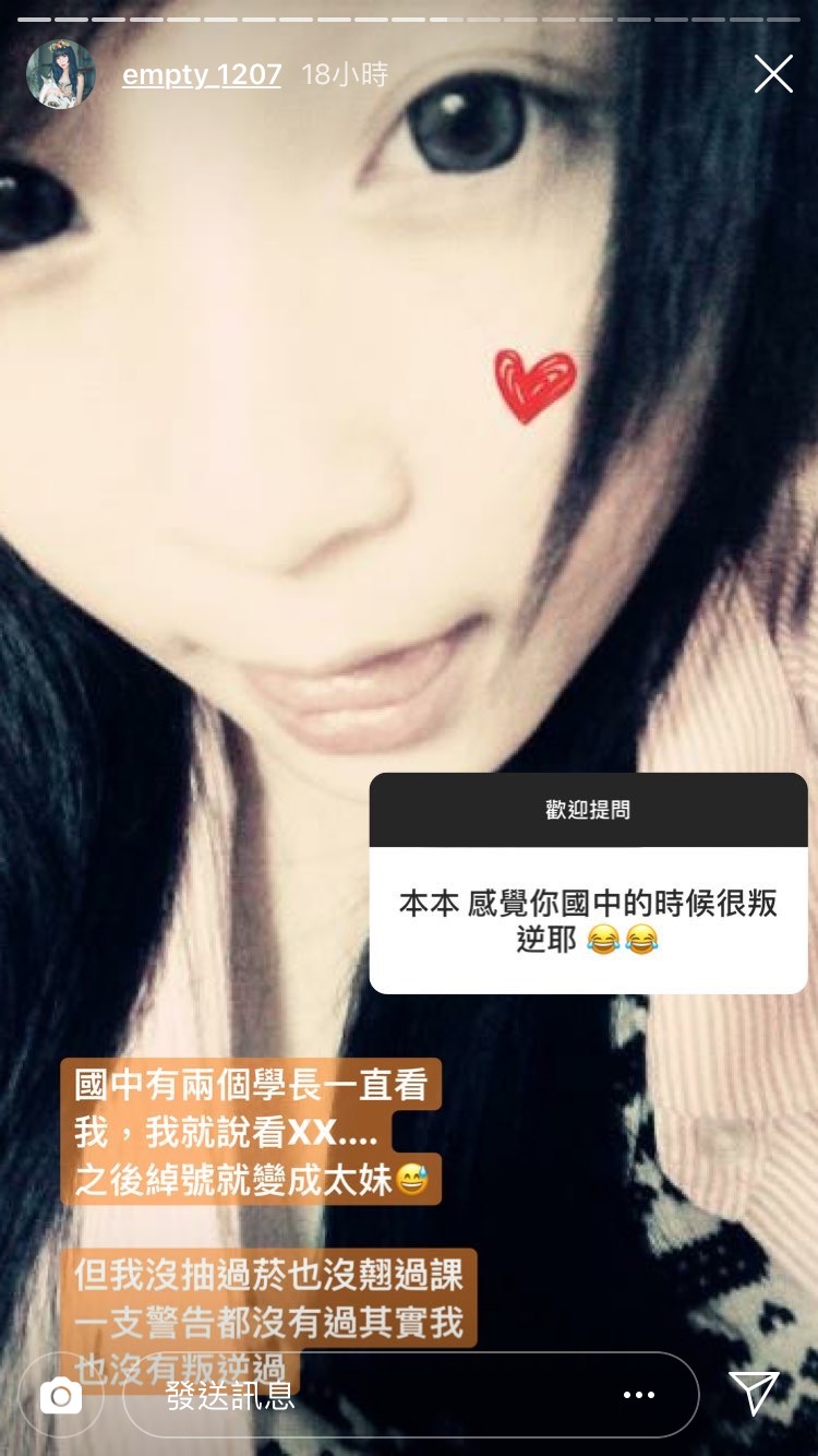 本本5日在IG限時動態中和粉絲互動,而其中有粉絲提問:「本本,感覺你國中的時候很叛逆耶」,而本本則放上一張過去的自拍照,只見本本學生時代便戴著瞳孔放大片,也看的出來並不是現在的齊劉海,反倒是旁分,與現在模樣相差甚鉅。她也尷尬自曝國中的綽號便是「太妹」,並且害羞說明原因:「國中有兩個學長一直看我,我就說看XX,之後綽號就變成太妹」,不過同時本本也強調自己其實沒有叛逆過:「但我沒抽過菸,也沒翹過課,一支警告都沒有過」。