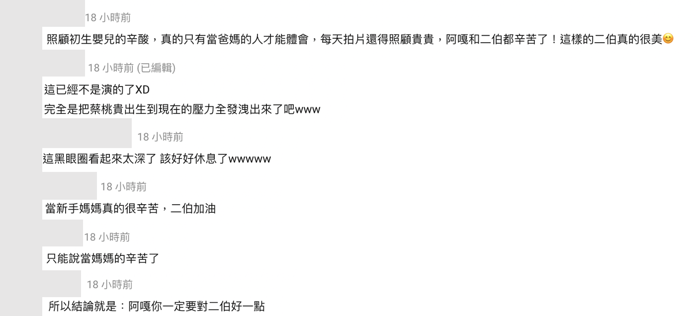 看完影片的網友也心疼二伯,紛紛留言表示:「照顧初生嬰兒的辛酸,真的只有當爸媽的人才能體會」、「這已經不是演的了XD完全是把蔡桃貴出生到現在的壓力全發洩出來了吧」、「這黑眼圈看起來太深了 該好好休息了」、「當新手媽媽真的很辛苦,二伯加油」、「所以結論就是:阿嘎你一定要對二伯好一點」、「只能說當媽媽的辛苦了」