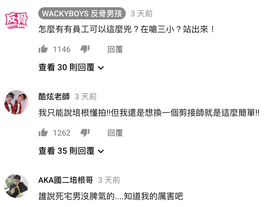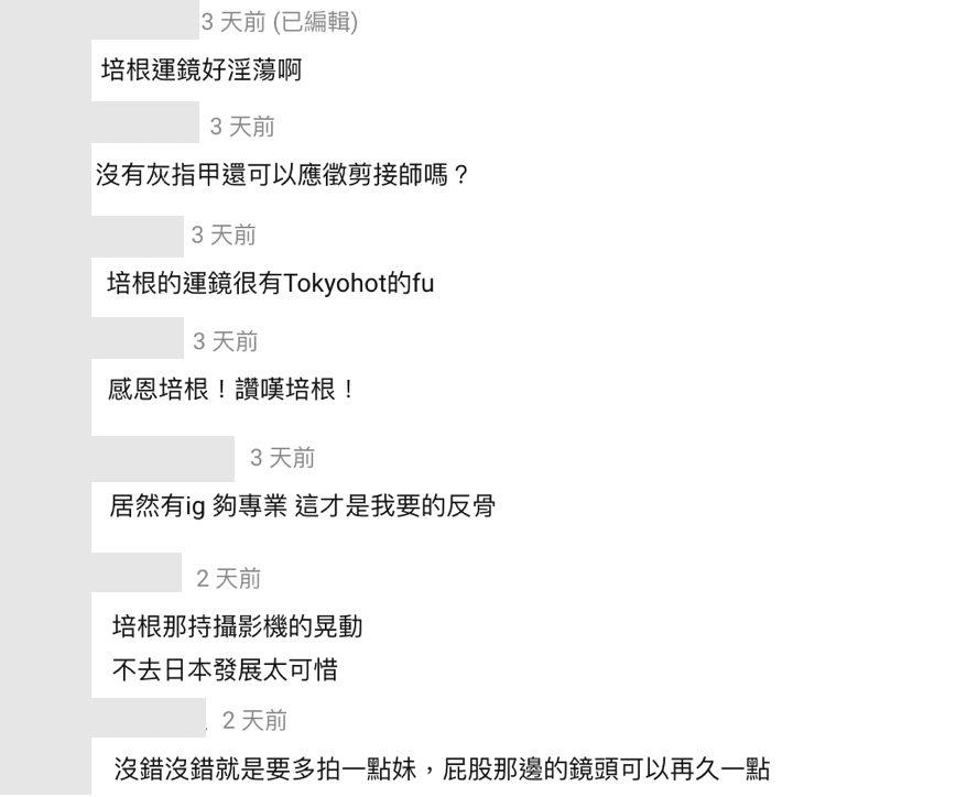 酷炫也在下方搞笑留言:「我只能說培根懂拍!但我還是想換一個剪接師就是這麼簡單」,而培根也留言:「誰說死宅男沒有脾氣的...知道我的厲害吧」,看完影片後網友也紛紛表示:「培根運鏡好淫蕩啊」、「沒有灰指甲還可以應徵剪接師嗎?」、「培根的運鏡很有Tokyohot的fu」、「培根那持攝影機的晃動 不去日本發展太可惜」、「沒錯沒錯就是要多拍一點妹,屁股那邊的鏡頭可以再久一點」、「感恩培根!讚嘆培根!」、「居然有ig 夠專業 這才是我要的反骨」,也有強大的網友在下方整理出影片中正妹的IG。