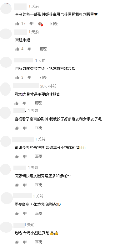 影片播出之後,許多網友也紛紛留言:「奈奈的每一部影片都很實用也很優質我打六顆星」、「自從訂閲奈奈之後,把妹越來越容易」、「反而默默的誘惑是最棒的行銷自已」、「聊天的過程中用故事畫出一個美好的體驗,讓女生有情緒上的幻想,這也是一種情緒投資」、「同意!大腦才是主要的性器官」,引起許多討論。